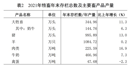畜牧业占农林牧渔业总产值比重21.6%,比上年减少1.3个百分点。牲畜年末存栏总数及主要畜产品产量见表2。