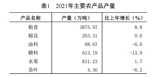 粮食总产量3875.97万吨,比上年增加313.23万吨,增长8.8%(见图3)。主要农产品产量见表1。