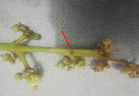 图3 海南被害的荔枝花穗-3(2018.02.14,示花穗轴上的蒂蛀虫化蛹孔)