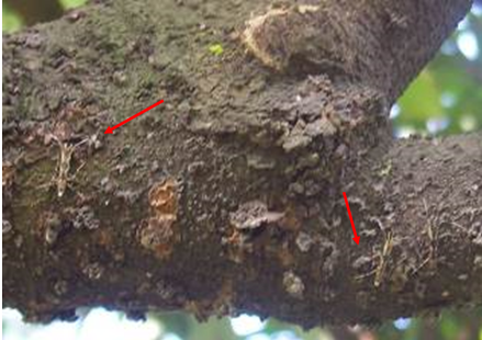 3.继续监测树干上荔枝蒂蛀虫成虫,并依具体情况决定是否需要补药喷杀。根据成虫白天栖于阴凉的树冠内枝杆上(如图10),受到惊吓时会飞离枝杆这一特性,施药后每天清晨到果园进行实地调查,拍打荔枝内膛枝杆,如发现还有成虫飞出,2天后再次喷药。