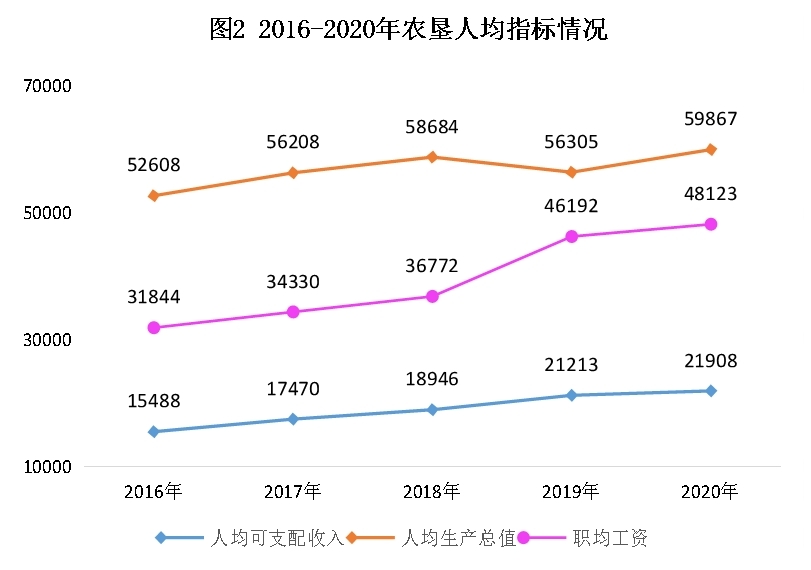 全年农垦经济实现生产总值18279.79亿元(见图1),比上年增长5.0%。其中,第一产业增加值1982.30亿元;第二产业增加值3288.94亿元;第三产业增加值3008.55亿元。第一、第二、第三产业增加值占农垦生产总值的比重分别为24.0%、39.7%和36.3%。人均生产总值59867元,比上年增长6.3%;人均可支配收入持续增长,达到21908元,比上年增长3.3%(见图2)。