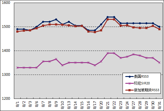 国外主产区:8月份,泰国RSS3平均价格为1510美元/吨,环比上涨11美元/吨,最高价为1540美元/吨,最低价为1485美元/吨;印尼SIR20平均价格为1357美元/吨,环比上涨34美元/吨,最高价为1390美元/吨,最低价为1330美元/吨;新加坡期货市场到期RSS3现货月平均价格为1499美元/吨,环比下跌2美元/吨,最高价为1531美元/吨,最低价为1477美元/吨。