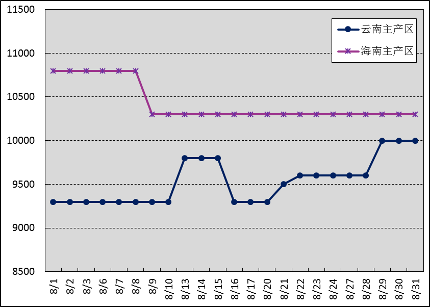 国内主产区:8月份,国内天然橡胶主产区处于产胶旺季,产区原料胶水价格维持低位。其中云南和海南的原料胶胶水(折干胶)月均价格分别为9530元/吨、10430元/吨,环比分别上涨121元/吨和下跌370元/吨。
