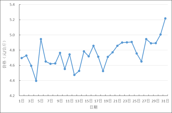8月,全国重点监测农产品批发市场香蕉总交易量达8.9万吨,同比下降7.3%,环比持平;总交易价值42482.7万元,同比下降0.5%,环比增长5.9%。日平均价格最高为5.2元/公斤,最低为4.4元/公斤,全月平均价格为4.8元/公斤,同比上涨6.7%,环比上涨6.7%(每日价格变化如图)。