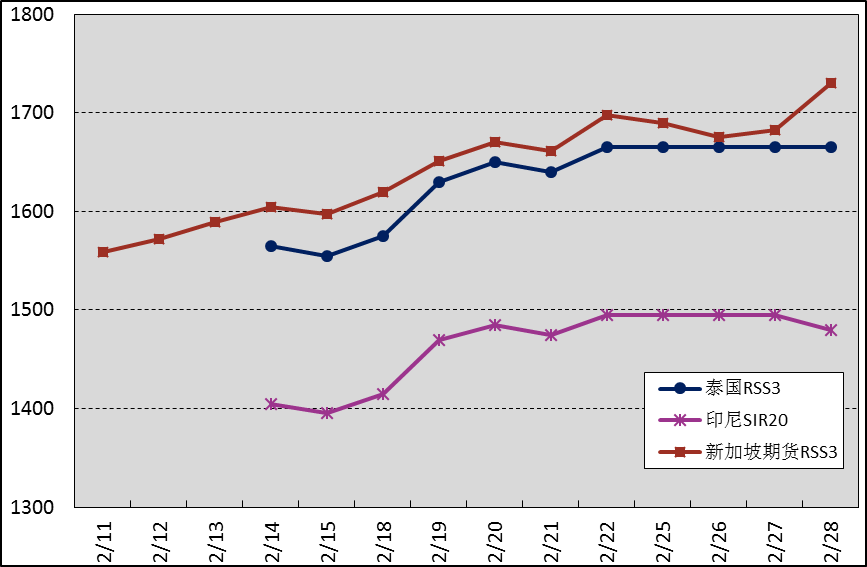 国外主产区:2月,泰国RSS3平均价格为1631美元/吨,环比上涨131美元/吨,最高价为1665美元/吨,最低价为1555美元/吨;印尼SIR20平均价格为1464美元/吨,环比上涨74美元/吨,最高价为1495美元/吨,最低价为1395美元/吨;新加坡期货市场到期RSS3现货月平均价格为1643美元/吨,环比上涨58美元/吨,最高价为1730美元/吨,最低价为1559美元/吨。