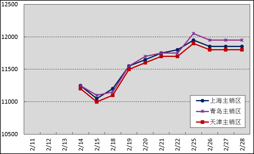 国内主销区:2月,国产全乳标准胶上海市场平均价格11614元/吨,环比上涨619元/吨,最高价为11950元/吨,最低价为11050元/吨;青岛市场平均价格11650元/吨,环比上涨684元/吨,最高价为12050元/吨,最低价为11100元/吨;天津市场平均价格11555元/吨,环比上涨665元/吨,最高价为11900元/吨,最低价为11000元/吨。
