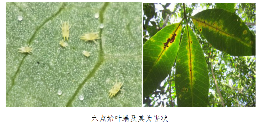 橡胶树常出现的害螨有黄蜘蛛(六点始叶螨)和红蜘蛛(东方真叶螨和比哈小爪螨等)。这些害螨有时呈单一种类发生,有时多种同时发生,主要以口针刺入植物组织吸取细胞液而造成危害。受害叶片初期受害点呈灰白色斑点,继而变黄色乃至黄褐色,且受害斑不断扩大,严重时整个叶片黄化脱落。高温干旱及叶片上白粉病等病害引起的残存病斑加快加重叶片黄化和落叶,致使胶园停割,影响产量。