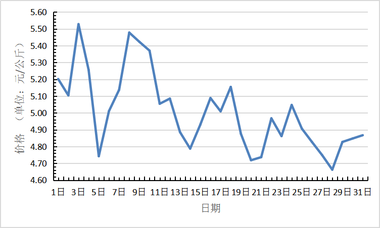 7月,全国重点监测农产品批发市场香蕉总交易量达10.2万吨,同比增长14.6%,环比增长4.1%;总交易额50855.1万元,同比增长26.8%,环比下降0.7%。日平均价格最高为5.5元/公斤,最低为4.7元/公斤,全月平均价格为5.0元/公斤,同比上涨11.1%,环比下跌3.8%(每日价格变化如图)。