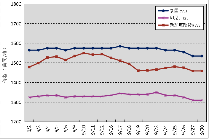 国外主产区:9月,泰国RSS3平均价格为1568美元/吨,环比下跌19美元/吨,最高价为1585美元/吨,最低价为1535美元/吨;印尼SIR20平均价格为1332美元/吨,环比上涨17美元/吨,最高价为1350美元/吨,最低价为1310美元/吨;新加坡期货市场到期RSS3现货月平均价格为1500美元/吨,环比上涨8美元/吨,最高价为1550美元/吨,最低价为1459美元/吨。