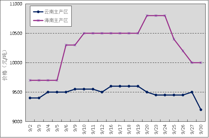 国内主产区:9月,我国天然橡胶主产区正常割胶。本月各产地原料胶价格较上月均有不同程度上涨,海南和云南原料胶(折干胶)月均价格分别为10295元/吨和9493元/吨,环比分别上涨550元/吨和254元/吨。