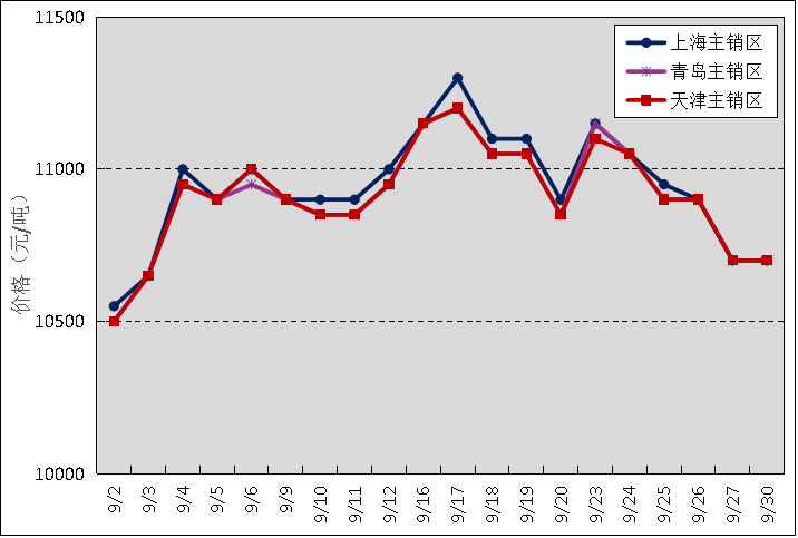 国内主销区:9月,国产全乳标准胶上海市场平均价格10940元/吨,环比上涨583元/吨,最高价为11300元/吨,最低价为10550元/吨;青岛市场平均价格10910元/吨,环比上涨580元/吨,最高价为11200元/吨,最低价为10500元/吨;天津市场平均价格10910元/吨,环比上涨583元/吨,最高价为11200元/吨,最低价为10500元/吨。