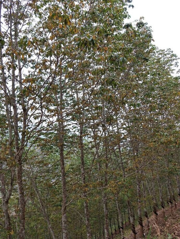 (四)适时割胶。在严重的旱情还没有解除之前,避免割胶加剧橡胶树落叶及其他伤害。对干旱和白粉病造成橡胶树落叶的胶园,专家建议橡胶树新抽嫩叶达到95 %老化率后20天且旱情缓解方可开割;对于第一蓬叶量勉强可开割的橡胶林,也应推迟开割时间或降低割胶强度,直到旱情缓解。