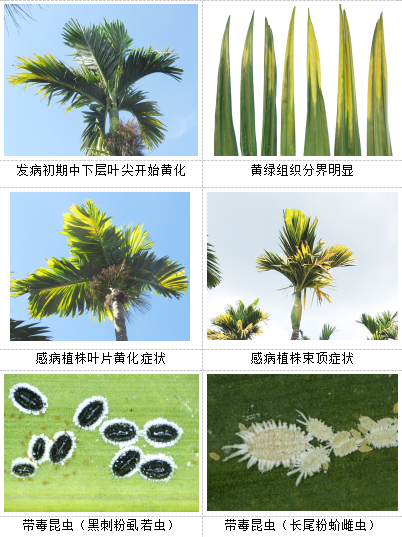 长线形病毒一般由粉蚧、粉虱或蚜虫传播,而这几类刺吸式口器昆虫在黄化槟榔园内都非常常见,目前也在病园中采集的长尾粉蚧和黑刺粉虱体内检测到该病毒。鉴于槟榔长线形病毒黄化病分布范围广、发生面积大、危害损失重的特点,槟榔病虫害监测与防控项目专家组提醒槟榔产区有关部门和广大槟榔种植户,要采取综合防控措施,及时控制病害的传播蔓延。