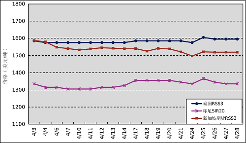 国外主产区:4月,泰国RSS3平均价格为1583美元/吨,环比上涨15美元/吨,最高价为1605美元/吨,最低价为1575美元/吨;印尼SIR20平均价格为1332美元/吨,环比上涨1美元/吨,最高价为1365美元/吨,最低价为1305美元/吨;新加坡RSS3期货主力合约月均结算价格为1536美元/吨,环比下降47美元/吨,最高价为1587美元/吨,最低价为1497美元/吨。