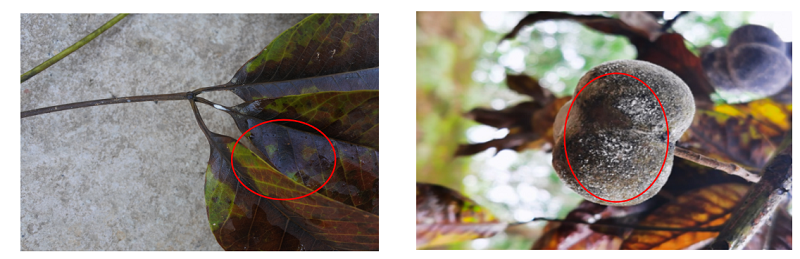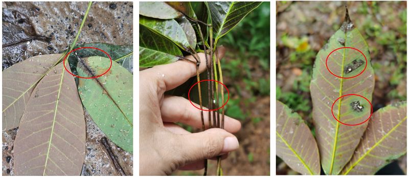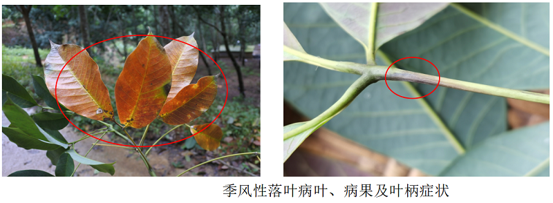季风性落叶病可危害橡胶树叶片、嫩枝和胶果。嫩叶感病初期呈暗绿色水渍状病斑,随后变黑,凋萎脱落,新落的病叶一般叶色浓绿新鲜、叶面无其他异常现象,若将叶柄剖开,可见髓部变为黑褐色;老叶的典型症状一般是叶柄基部先感病,初期呈水渍状黑色条斑,病部溢出1-2滴凝胶,凝胶初为白色,后变黑,叶片褐红色。严重发生时,病斑在叶柄上扩展,整个叶片连同叶柄很快脱落。枝条感病后,在绿色部分出现凝胶和水渍状暗斑,随后回枯变褐色,叶片凋萎下垂,挂在干枝上不易脱落。绿色胶果发病初期,果面呈现水渍状褐色病斑,溢出白色凝胶,病斑扩展后全果腐烂。天气潮湿时,病果表面上长出白色霉层。