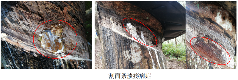 割面条溃疡病主要危害割面,每年3-12月均可发生,发病初期在橡胶树割面新割线上出现一条至数条排列成栅栏状的竖立黑线,深达木质部。黑线继续扩展成病斑或块斑,天气潮湿时,病斑表面长出白色霉状物。皮下溢胶可导致皮层爆裂、隆起,木质部变黑褐色。