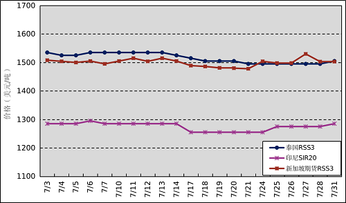 国外主产区:7月,泰国RSS3平均价格为1515美元/吨,环比下跌73美元/吨,最高价为1535美元/吨,最低价为1495美元/吨;印尼SIR20平均价格为1275美元/吨,环比下跌19美元/吨,最高价为1295美元/吨,最低价为1255美元/吨;新加坡RSS3期货主力合约月均结算价格为1500美元/吨,环比下跌35美元/吨,最高价为1530美元/吨,最低价为1478美元/吨。