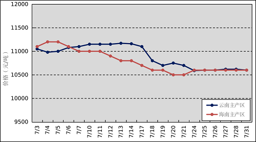 国内主产区:7月,国内产区正常割胶,其中,云南降雨偏多,产量较往年同期偏少;海南上中旬稳定上量,中下旬受台风天气影响,胶水产出有所减少。云南和海南原料胶(折干胶)月均价格分别为10889元/吨、10790元/吨,环比下跌107元/吨、495元/吨。