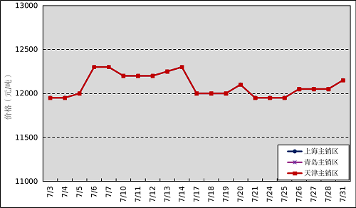 国内主销区:7月,国产全乳标准胶上海市场平均价格12090元/吨,环比上涨260元/吨,最高价为12300元/吨,最低价为11950元/吨;青岛市场平均价格12090元/吨,环比上涨260元/吨,最高价为12300元/吨,最低价为11950元/吨;天津市场平均价格12090元/吨,环比上涨260元/吨,最高价为12300元/吨,最低价为11950元/吨。