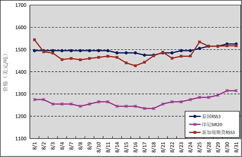 国外主产区:8月,泰国RSS3平均价格为1496美元/吨,环比下跌19美元/吨,最高价为1525美元/吨,最低价为1475美元/吨;印尼SIR20平均价格为1265美元/吨,环比下跌10美元/吨,最高价为1315美元/吨,最低价为1235美元/吨;新加坡RSS3期货主力合约月均结算价格为1479美元/吨,环比下跌21美元/吨,最高价为1544美元/吨,最低价为1427美元/吨。