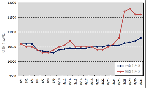 国内主产区:8月,国内产区受降雨偏多以及台风、高温等异常天气扰动影响,原料胶产出有限,月内原料胶价格出现不同程度上涨,其中,海南产区月末胶水价格拉涨明显,但本月均价仍低于上月的。云南和海南原料胶(折干胶)月均价格分别为10509元/吨、10702元/吨,环比下跌380元/吨、88元/吨。