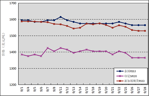 国外主产区:9月,泰国RSS3平均价格为1583美元/吨,环比上涨87美元/吨,最高价为1615美元/吨,最低价为1565美元/吨;印尼SIR20平均价格为1395美元/吨,环比上涨130美元/吨,最高价为1425美元/吨,最低价为1365美元/吨;新加坡RSS3期货主力合约月均结算价格为1564美元/吨,环比上涨85美元/吨,最高价为1588美元/吨,最低价为1530美元/吨。