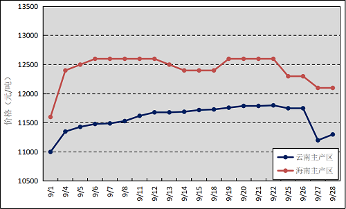 国内主产区:9月,国内产区受反复降雨天气影响,割胶工作进程放缓,胶水产出偏少,拉涨原料价格。云南和海南原料胶(折干胶)月均价格分别为11577元/吨、12420元/吨,环比上涨1068元/吨、1718元/吨。