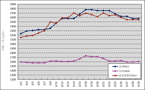国外主产区:3月,泰国RSS3平均价格为2553美元/吨,环比上涨396美元/吨,最高价为2775美元/吨,最低价为2235美元/吨;印尼SIR20平均价格为1625美元/吨,环比上涨88美元/吨,最高价为1735美元/吨,最低价为1575美元/吨;新加坡RSS3期货主力合约月均结算价格为2514美元/吨,环比上涨436美元/吨,最高价为2700美元/吨,最低价为2149美元/吨。
