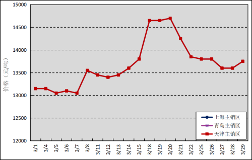 国内主销区:3月,国产全乳标准胶上海市场平均价格13686元/吨,环比上涨849元/吨,最高价为14700元/吨,最低价为13050元/吨;青岛市场平均价格13686元/吨,环比上涨849元/吨,最高价为14700元/吨,最低价为13050元/吨;天津市场平均价格13686元/吨,环比上涨849元/吨,最高价为14700元/吨,最低价为13050元/吨。